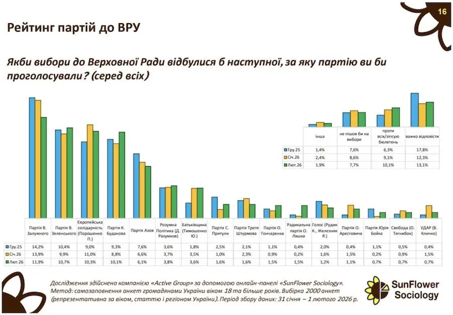 Партія Валерія Залужного, яка у грудні 2025 року мала 14,2% підтримки, у лютому знижується до 11,9%, демонструючи поступову втрату інерції.